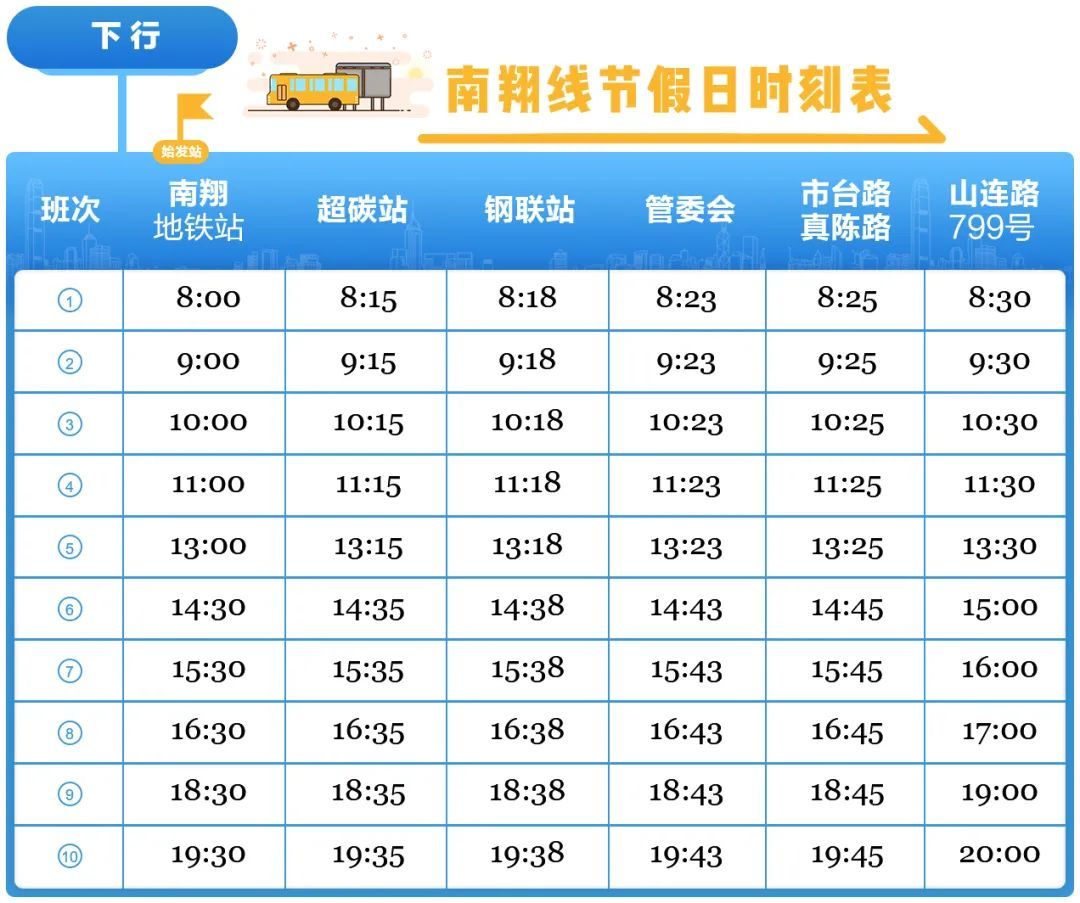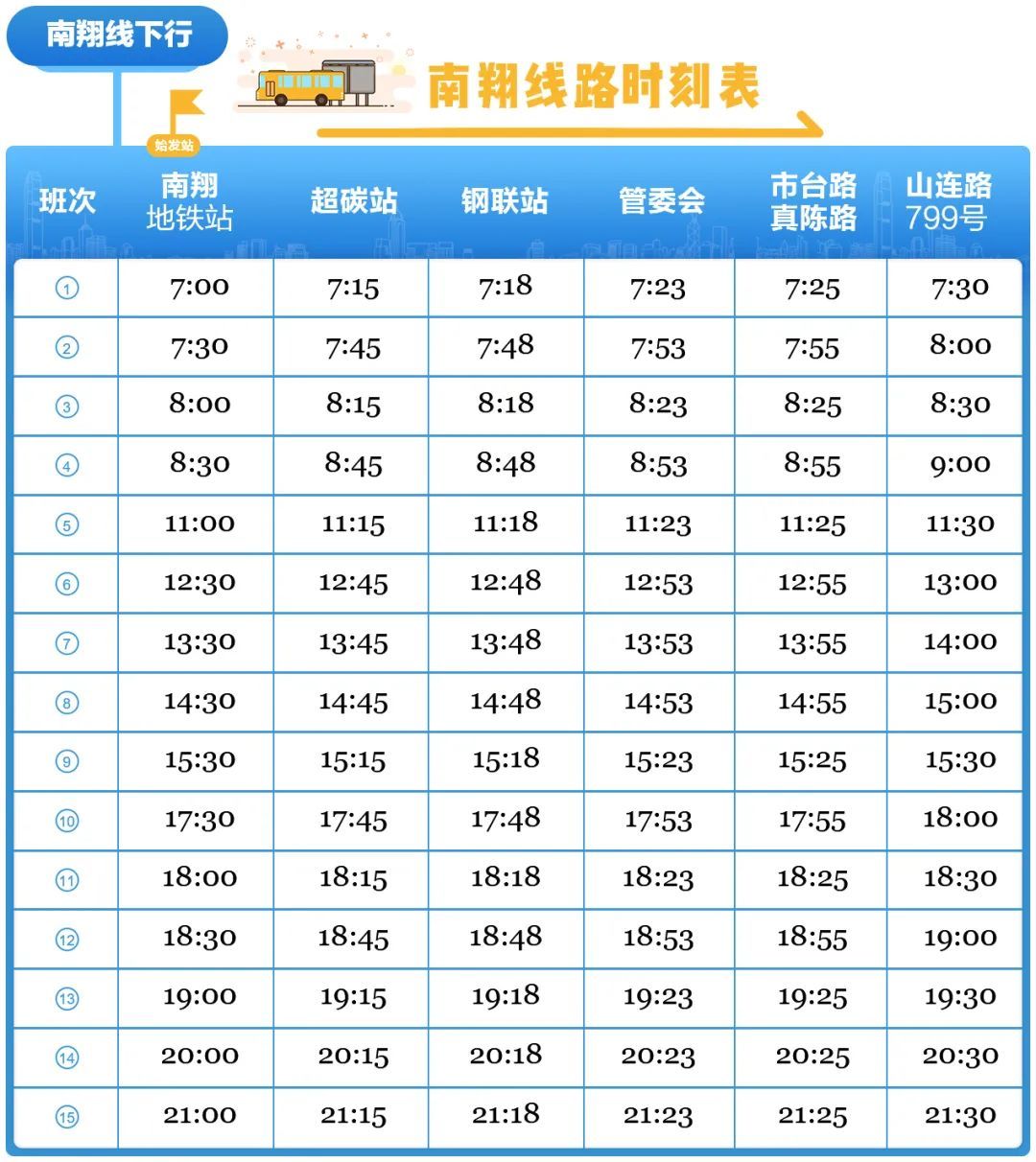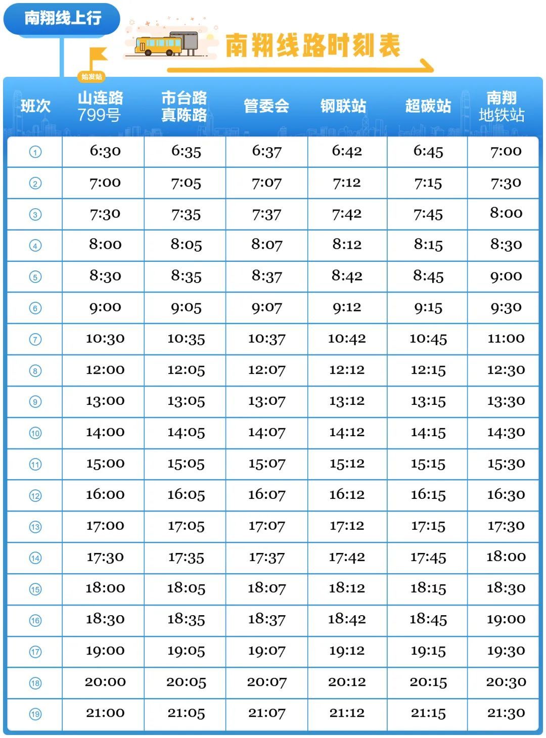 新开设的南翔线用以接驳园区企业、居民区与轨道交通11号线南翔地铁站,以山连路799号为起点至11号线南翔站,共设6个站点。线路主要途径广川、管委会、临港、钢联、超碳、科勒等企业,共设置30个班次,线路总长约18公里,单程约45分钟,班次安排隔时间为30分一班。