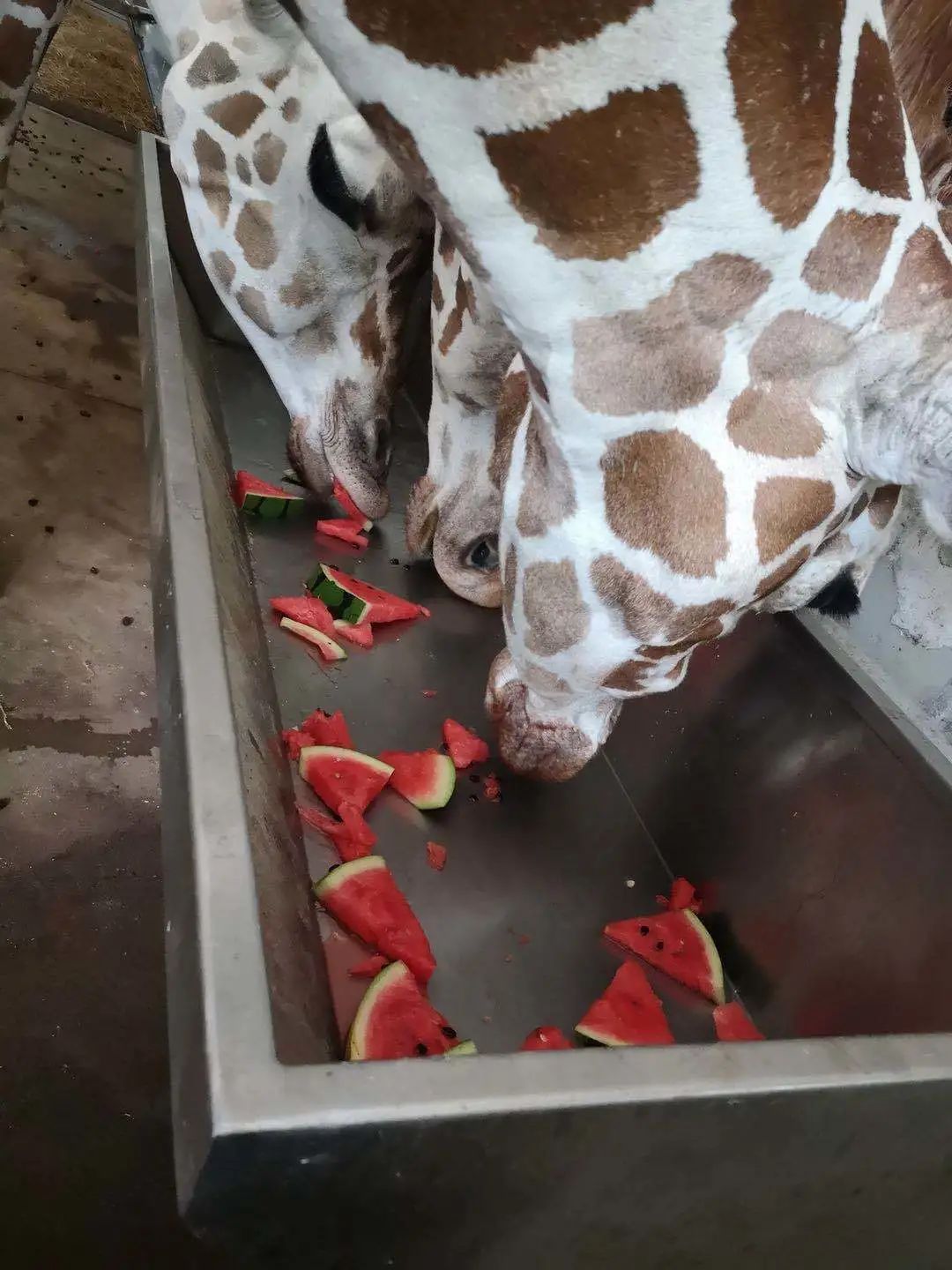 在长颈鹿展区,这些优雅的长脖子大高个一看见西瓜,立刻露出迫切的心情,纷纷冲向西瓜,快速抢占有利地形,长长的舌头配合牙齿,三下五除二就把西瓜消灭干净了。