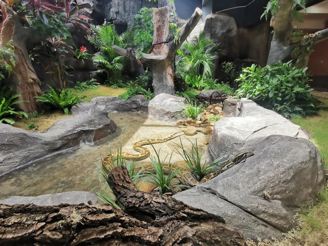 今年蟒蛇展区新装修,展区顶部增设天窗以便通风,此外还安装了排风扇、喷淋,营造溪流,供蟒蛇消暑。