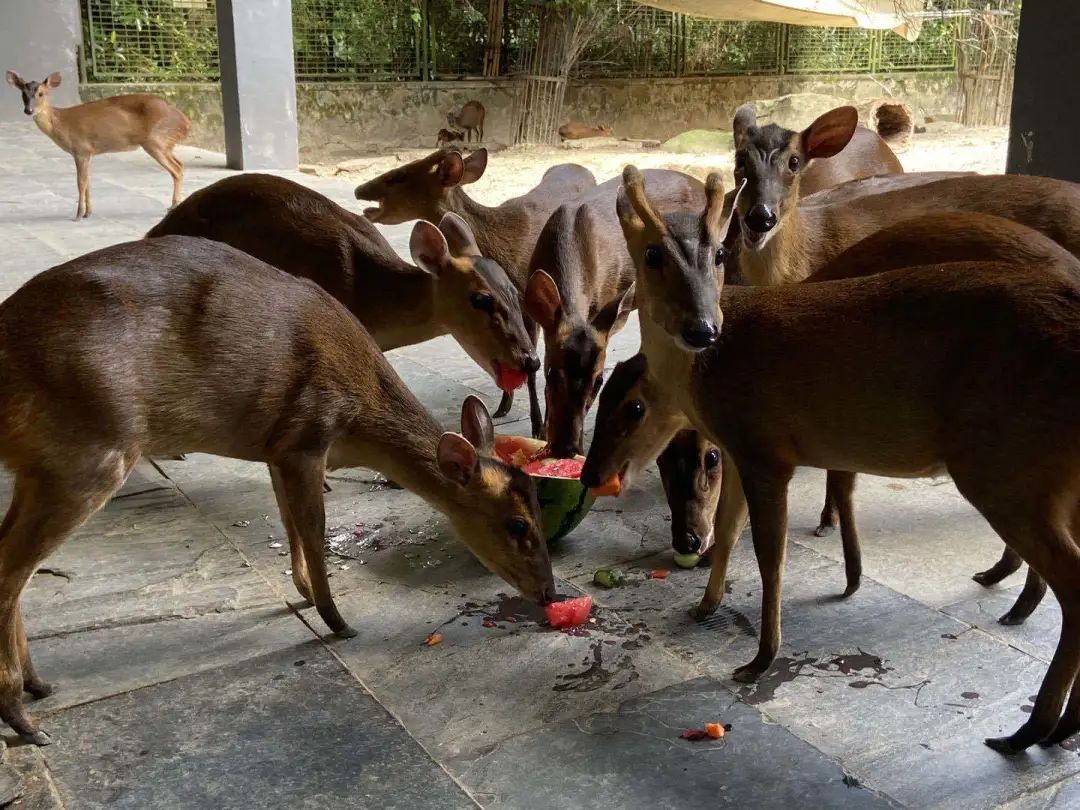 在黄麂展区,饲养员刚放下半只西瓜,小可爱们就纷纷从小木屋里、石头后探头张望。黄麂天性胆小,到了西瓜旁边这闻闻那舔舔,没过一会儿,就簇拥着西瓜大快朵颐了。