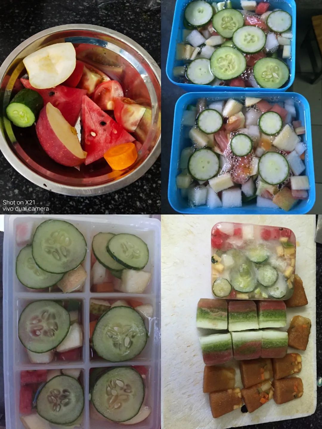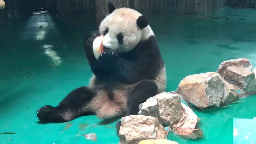 中午,饲养员会把水果冰放在室内,大熊猫会与午餐一起进食。大熊猫兄弟“和风”“星光”看到五颜六色的水果冰眼睛都发亮了。