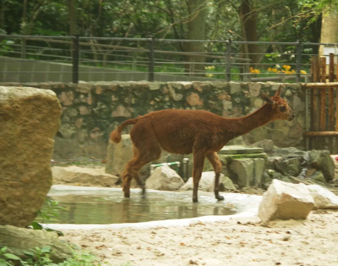 小羊驼笼舍内今年新建的水池终于派上了用场。虽然在入夏前,饲养员已减掉它们长长的毛发,但由于连日高温,仅剪去毛发还不够它们抵挡沪上暑热,最吸引它们的还是玩水消暑的方式,这一方天地为它们带来清凉的同时还带来了莫大的乐趣。