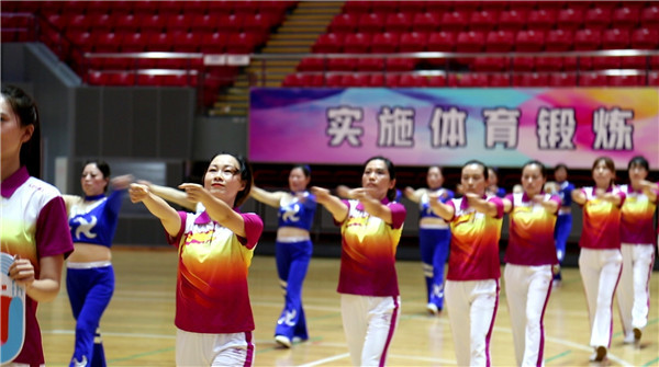 随着音乐响起,决赛正式开始。参赛选手身着队服,精神饱满,挥臂、踢腿、转身、弯腰,动作整齐划一。
