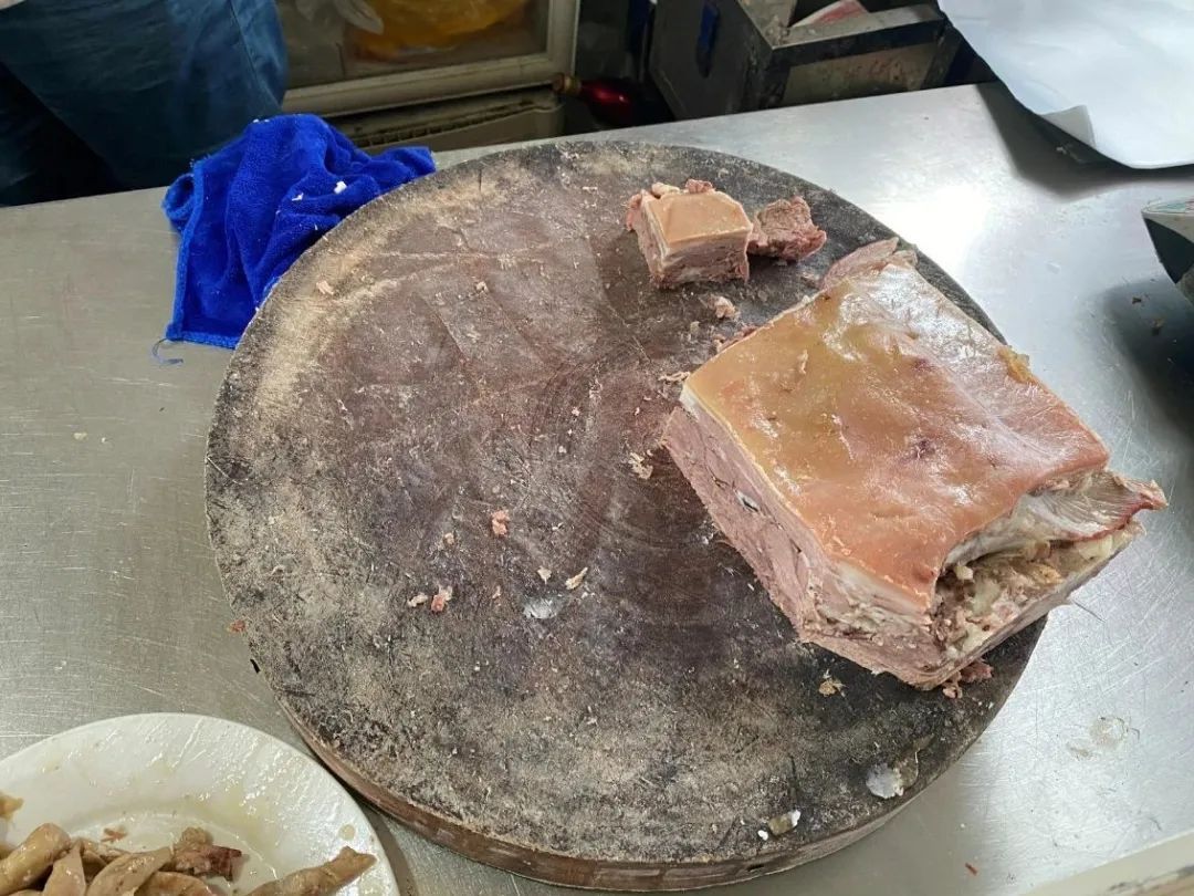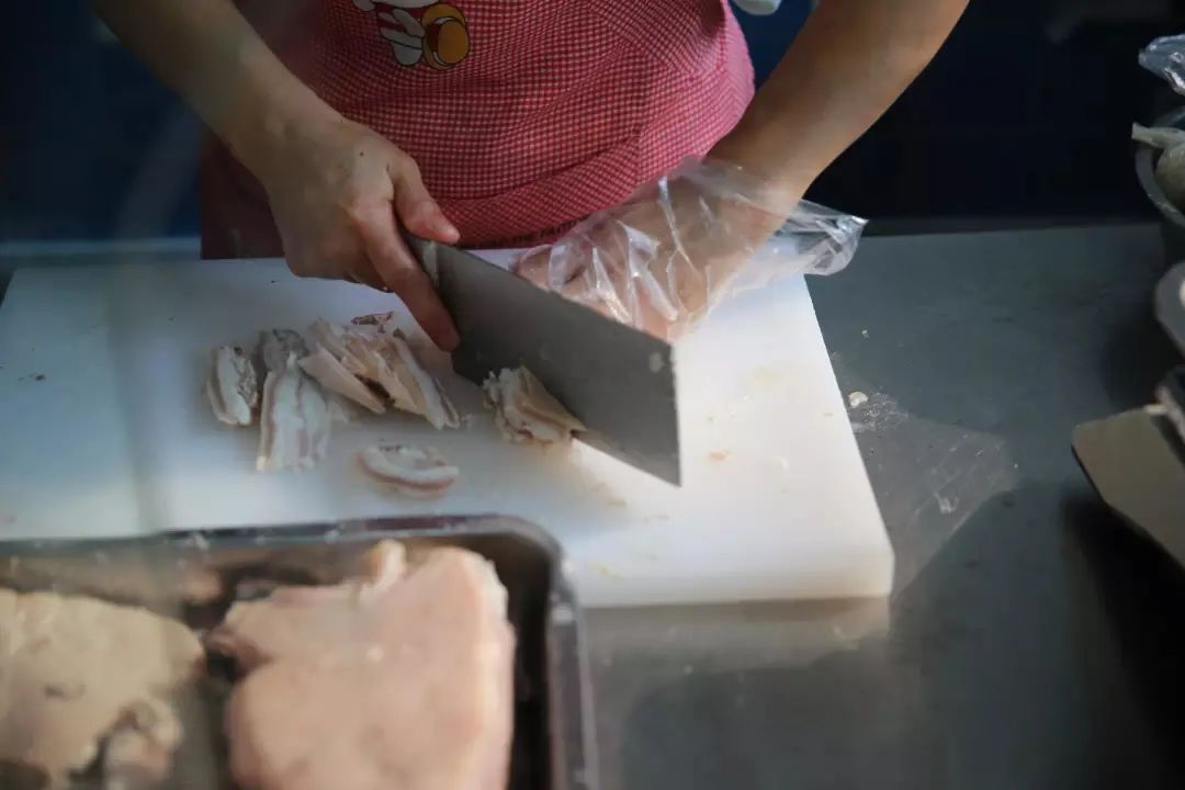 要进到店里面得先穿过菜市场,小店不大,是一个长条的形状,一进门的餐柜里是切好的羊肉、羊杂,老板娘在前面负责点餐,老板在后厨忙碌。经营了这么多年,店里的设施略显老旧,灯光也有些昏暗,但都干净整洁、井然有序。店内就十余张桌子,可是生意却是异常火爆,早上6点就已座无虚席,一年四季生意都很好。