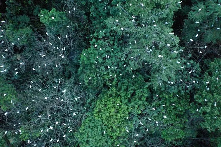 放眼望去,树冠上落满了白鹭星星点点,如同梨花绽放、雪压枝头。它们有的梳理羽毛,有的盘旋低飞,有的引颈啼鸣。