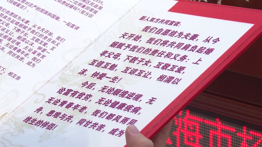 新人魏颃开心地说 :“这边的工作人员和刚才帮我们证婚的两位金婚老人,帮我们见证重要的时刻,送上他们的祝福,还叮嘱了我们很多小细节。这些让我们感到非常幸运,相信我们今天不光是日子挑得好,我们的人缘、眼缘也特别好。”