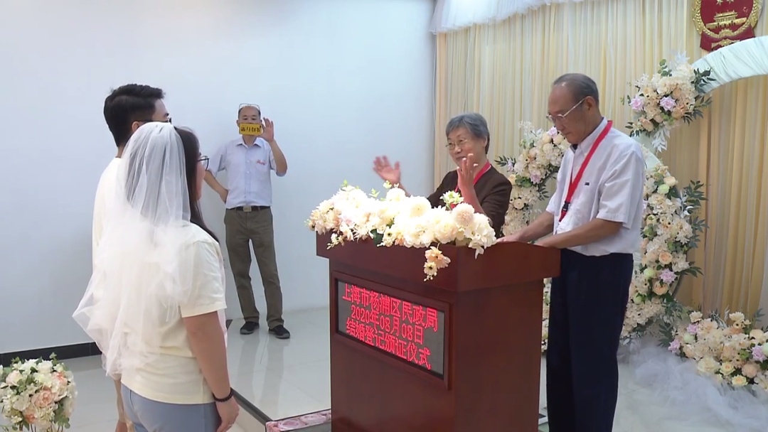 这是一场杨浦独有的颁证仪式。这对老夫妻并非专业颁证员,而是市民志愿者,已经度过金婚纪念日,前几年还被评为杨浦区最美家庭。由他们为新人颁结婚证,有着特殊的寓意。