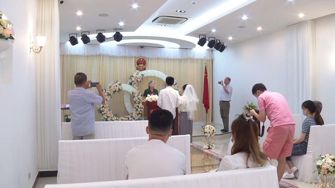 在杨浦区婚姻登记中心,装饰着花朵的颁证厅内,新人头戴白纱,手捧雏菊,缓步走在长毯上,仿佛正在进行一场简易版的结婚典礼,庄严而又甜蜜。