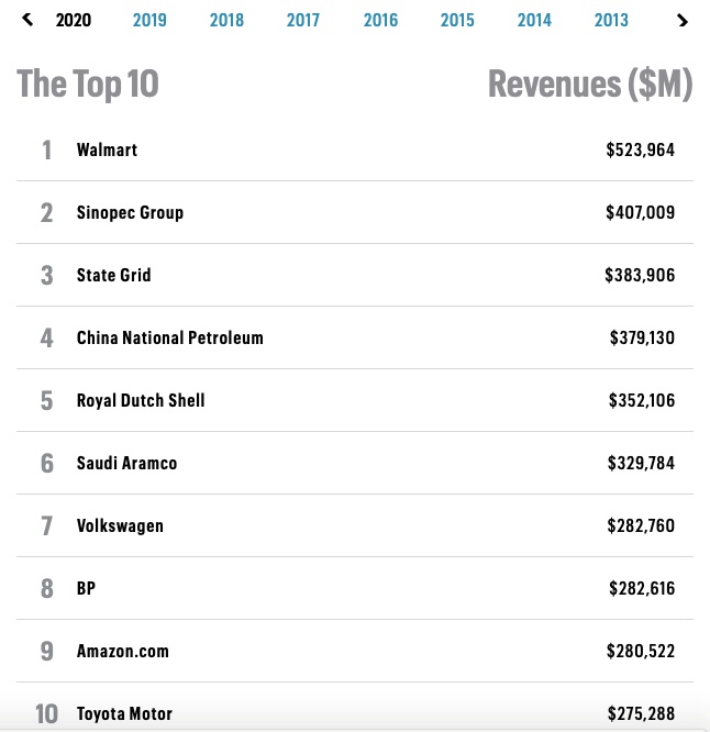 2020年《财富》世界500强排行榜揭晓,今年,沃尔玛连续第七年成为全球最大公司,中石化仍位列第二,国家电网上升至第三位,中石油位列第四,而壳牌石油下降至第五位。