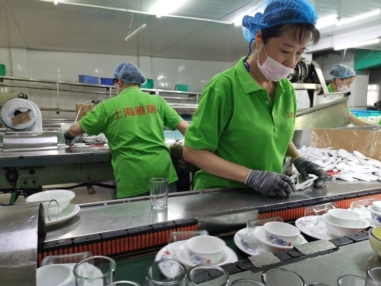 今天(8月11日)上午9时30分,上海雅瑞餐具清洁服务有限公司的回收清洁区内已经摆满了待清洁的碗筷杯勺等餐饮器具,公司日均清洁套装餐饮具的数量在7到8万套。
