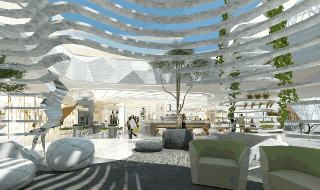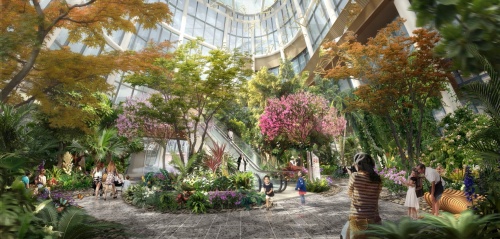 商场由三个主题玻璃盒组合呈现:以森林、湿地、高山为主题,像是一个度假胜地。