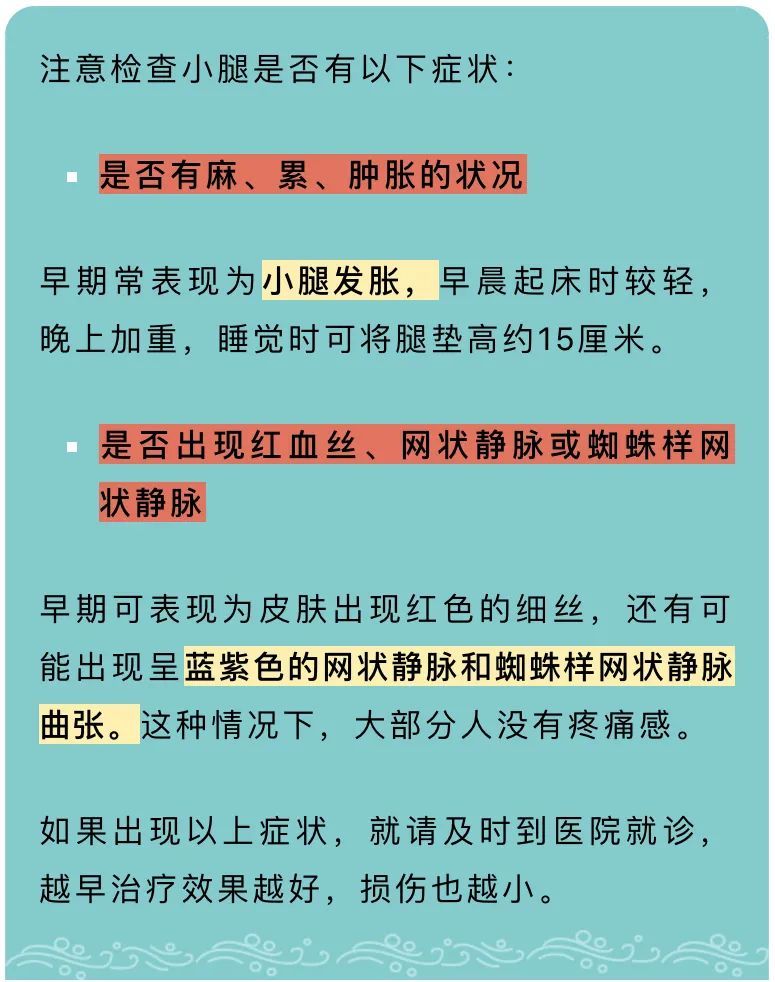 早期没有任何症状,只是腿部静脉隆起、扩张、弯曲或团块迂曲,呈“蚯蚓”状。
