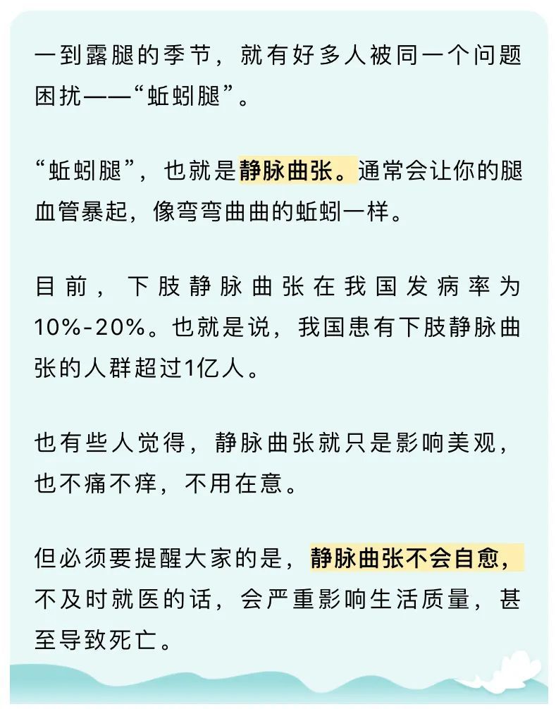 所以,如果患有下肢静脉曲张,不要不当回事,为了美观和健康,及早就医吧!