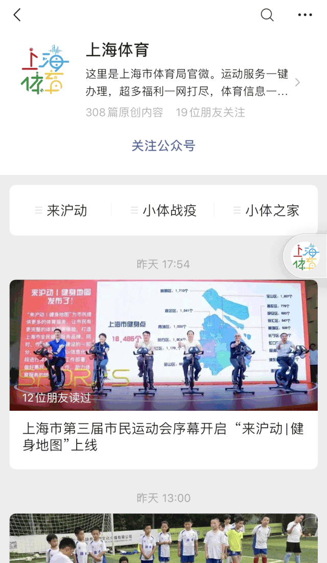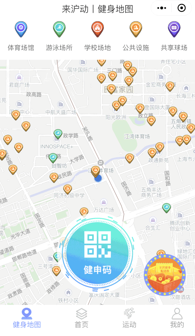 关注“上海体育”政务微信,点击菜单“来沪动”里的“健身地图”,进入“来沪动|健身地图”小程序。