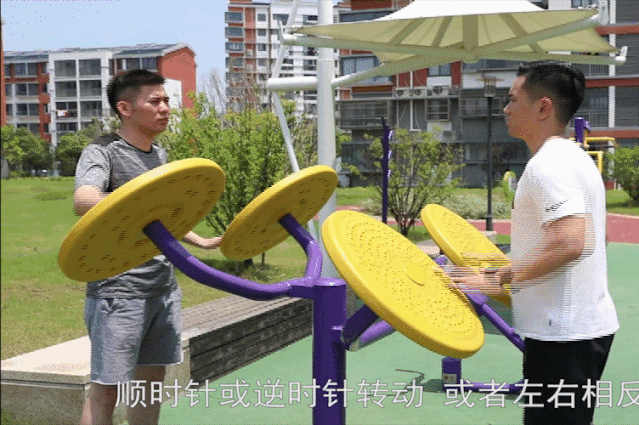使用方法:双腿成马步姿势,双手平摊在两个转盘上,顺时针或逆时针转动,或者左右相反转动。