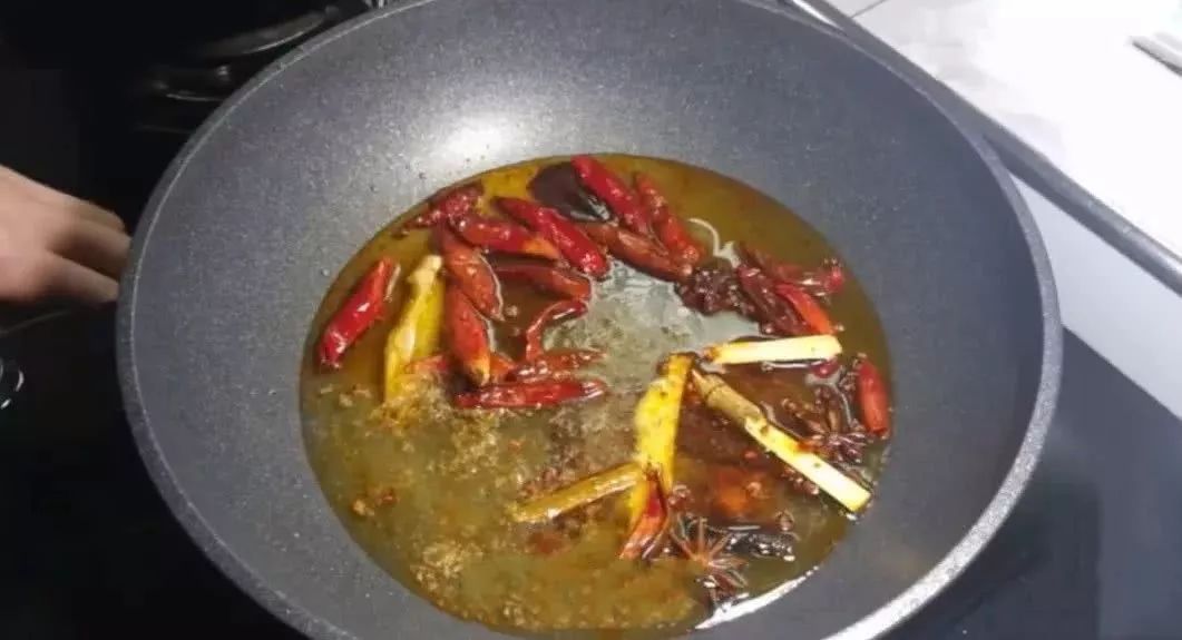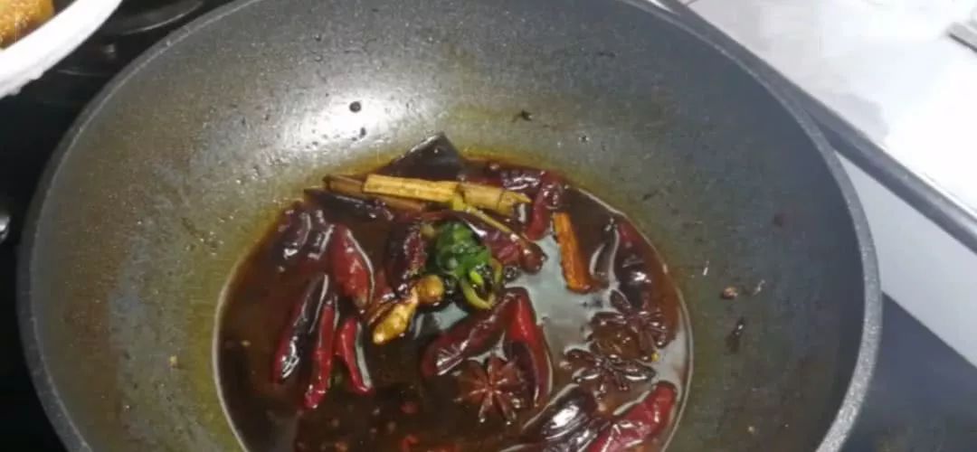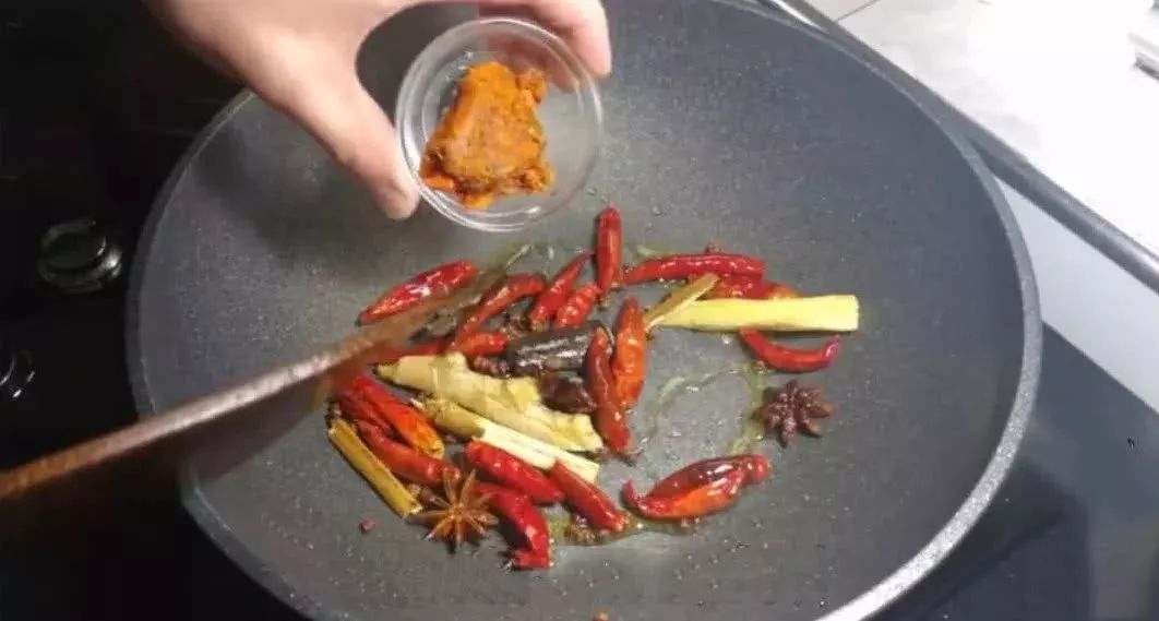 6、香料炒至闻到香味儿后加入火锅底料,继续用小火将火锅底料炒散即可。