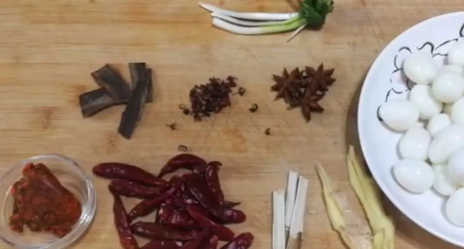 食材:鹌鹑蛋、生姜、小茴香、八角、干辣椒、花椒、香葱、桂皮、火锅底料。