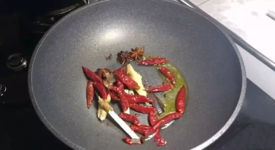 5、锅中留点底油,放入生姜、桂皮、小茴香、八角、花椒籽、干辣椒,开小火先将香料炒香,这一步至关重要,直接决定最后鹌鹑蛋的香味儿足不足。
