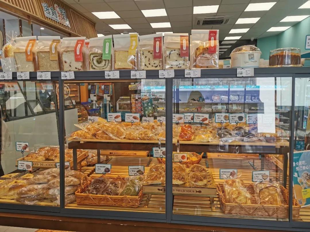 便利店中间一整排的面包柜格外引人注目,50多种面包陈列其中,特别醒目的地方摆放着上海国际饭店的蝴蝶酥,这也是百联逸刻与国际饭店联合推出的特色产品。