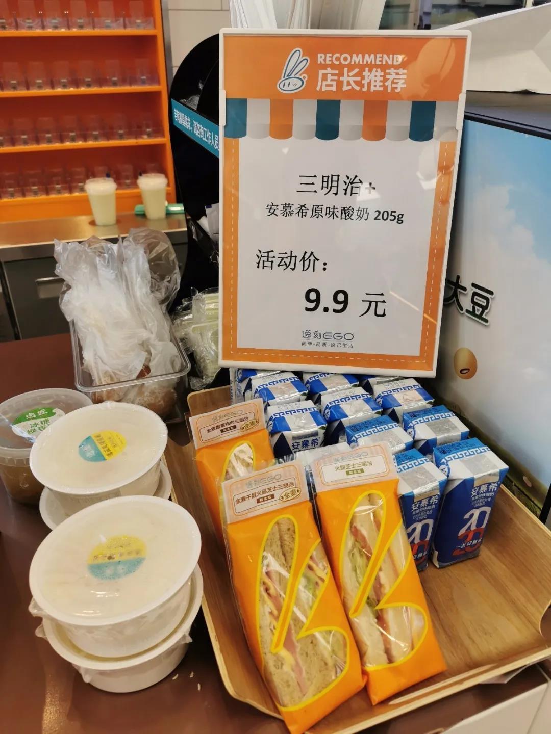 这家24小时便利店于7月15日开业,主要服务于德必易园近千名白领。每天的第一个消费高峰大约在早上8点到10点的早餐时间段,最畅销的是各类包子和饼类食品。百联逸刻每周还针对这部分客群推出不同的促销组合,如这周是9.9元购买酸奶+三明治早餐套餐,销量很不错。