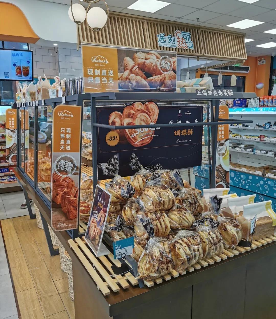便利店中间一整排的面包柜格外引人注目,50多种面包陈列其中,特别醒目的地方摆放着上海国际饭店的蝴蝶酥,这也是百联逸刻与国际饭店联合推出的特色产品。