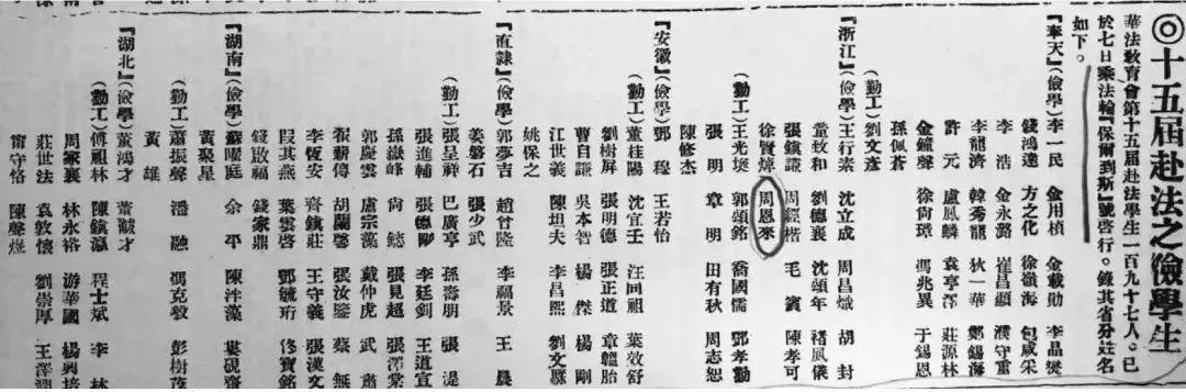 ▲1920年11月6日《民国日报》记载,乘“博尔多斯”号赴法学生姓名,周恩来在列。