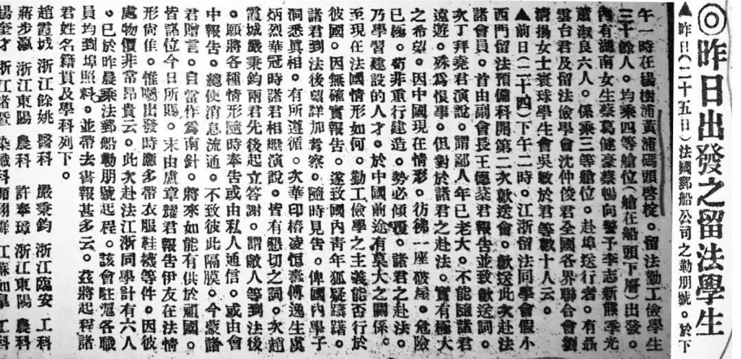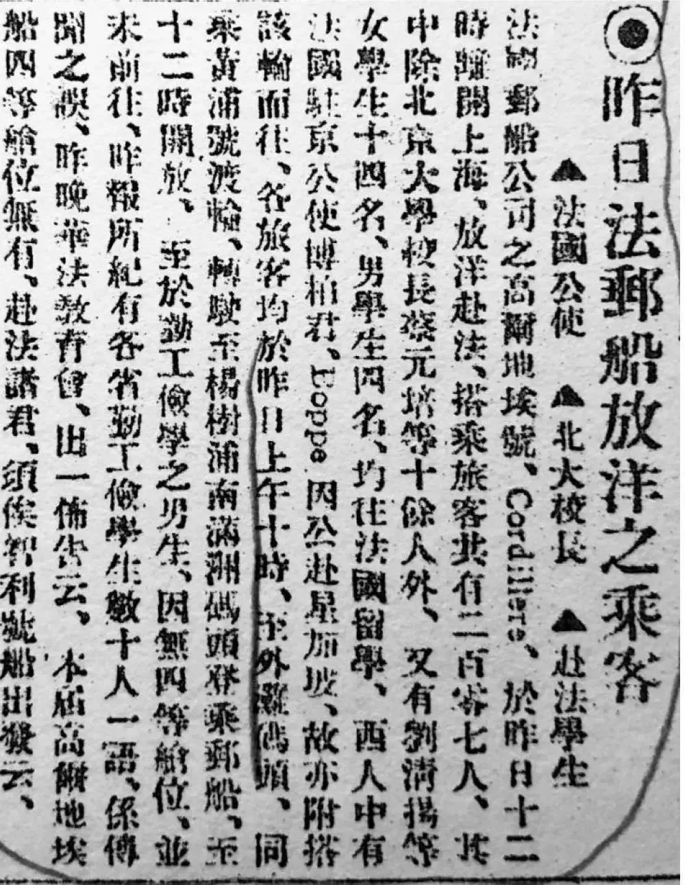 ▲1919 年12 月26 日《民国日报》之《昨日出发之留学生》一文内载:“昨日(二十五日)法国邮船公司之勒朋号。于下午一时在杨树浦黄浦码头启碇。”