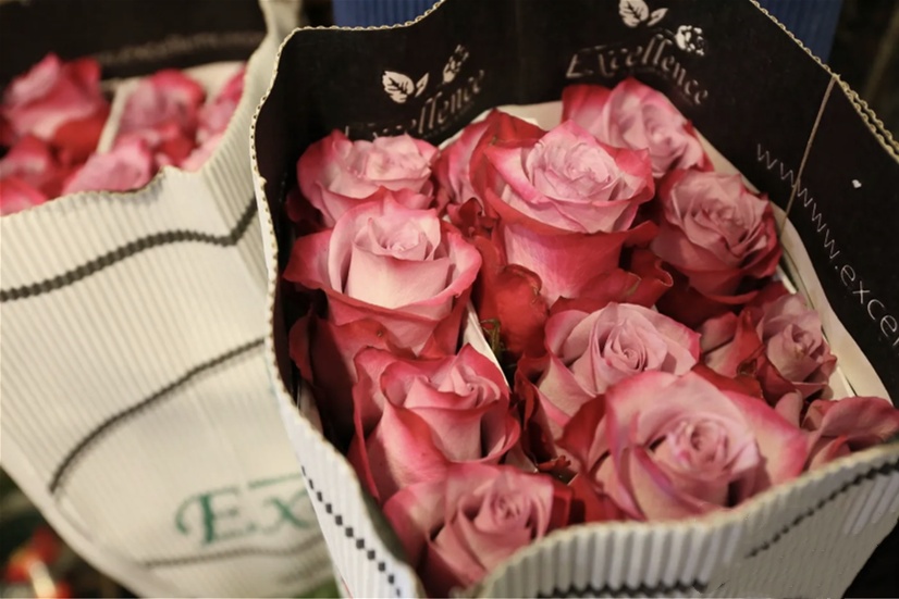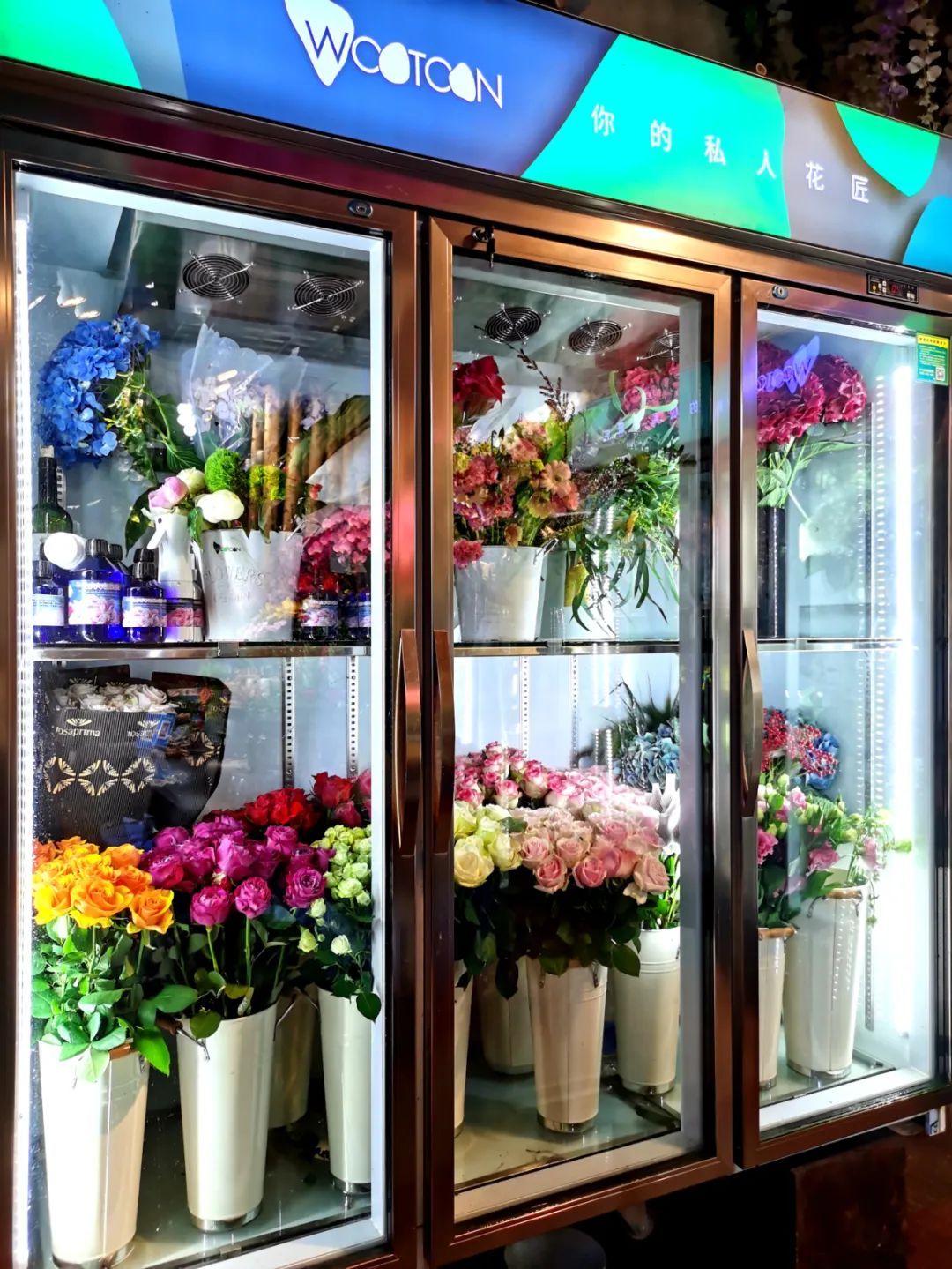 顾客可以自行从冷柜中挑选鲜花,并指定款式进行包装。不论是一支还是一束,经验丰富的花艺师——谭老板,都会精心挑选配色相符的包装纸和绳结,将鲜花装饰得更加和谐、亮丽。