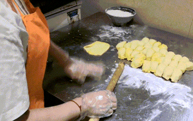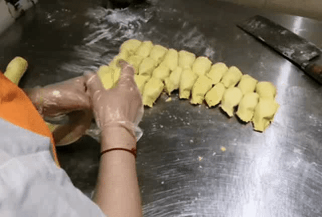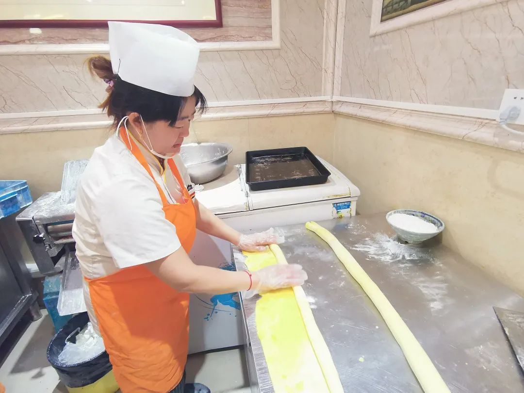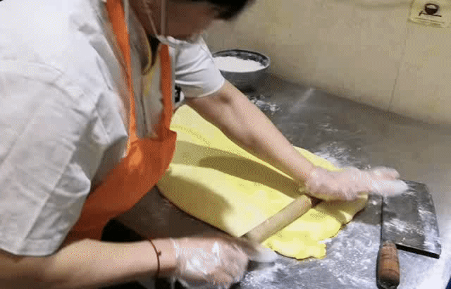 包在外面的面皮,按照4:3的比例用油皮把油酥包裹起来,经过反复多次的擀制增加面皮的层次和口感。