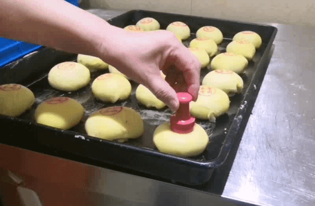 面皮包裹特制的肉馅,放入刷好油的铁盘中,再经过20多分钟的烘烤,金黄的月饼就出炉了。