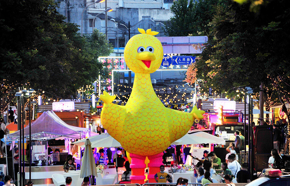 上海,BFC外滩枫径开始热闹起来,芝麻街“上街趣玩 FUN ON THE STREET”主题系列展登陆BFC外滩金融中心。一只6米高的“大鸟”仿佛从天而降,以鲜亮颜色和姿态热情地迎接八方来客,吸引游客纷纷拍照留影。