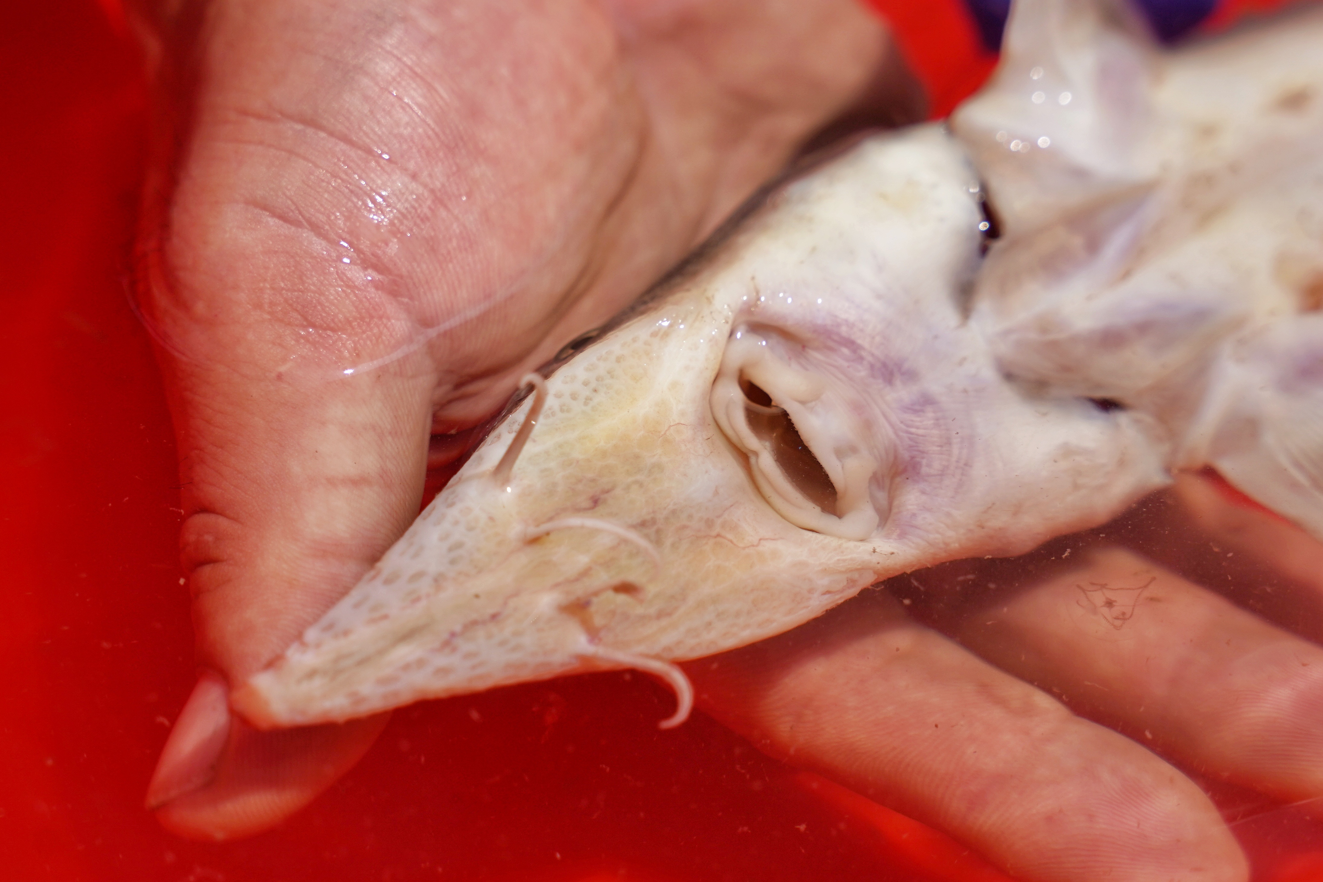 这条鱼嘴尖而突,口长在下腹,呈现“一”字形,口前有四条明显的触须。鱼的背部有菱形的骨板。渔民王先生告诉记者,他是昨天晚上在鱼塘内下的蟹笼,本来想捕蟹,没想到今天一早蟹笼捞起来后,发现里面竟然有一条从来都没看到过的“怪鱼”。