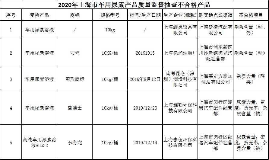 为了了解本市销售的车用尿素产品质量安全状况,近期,上海市市场监管局共组织抽查了60批次车用尿素产品,经检验,不合格5批次。涉及的不合格项目为:尿素含量、密度、折光率、杂质含量(醛类)、杂质含量(钙)、杂质含量(钠)。