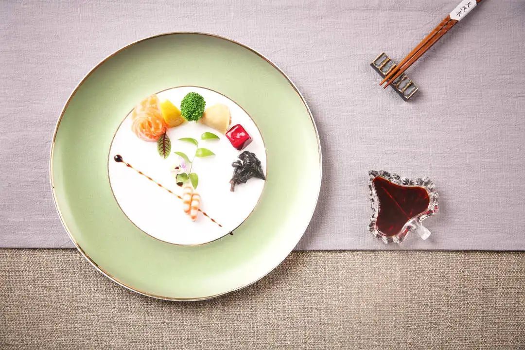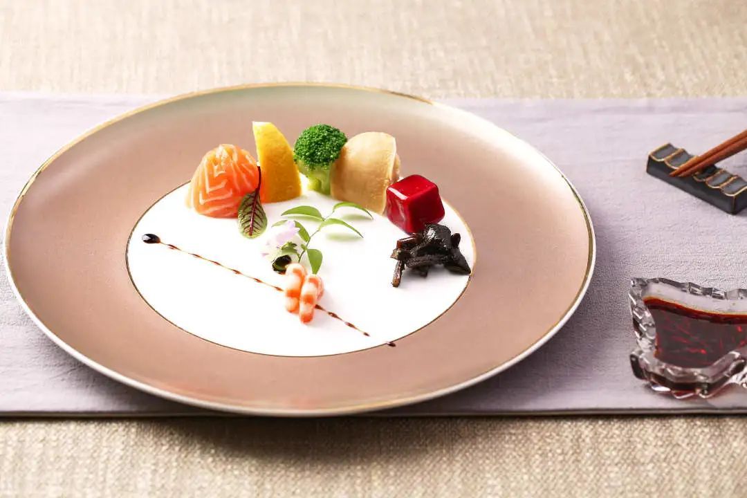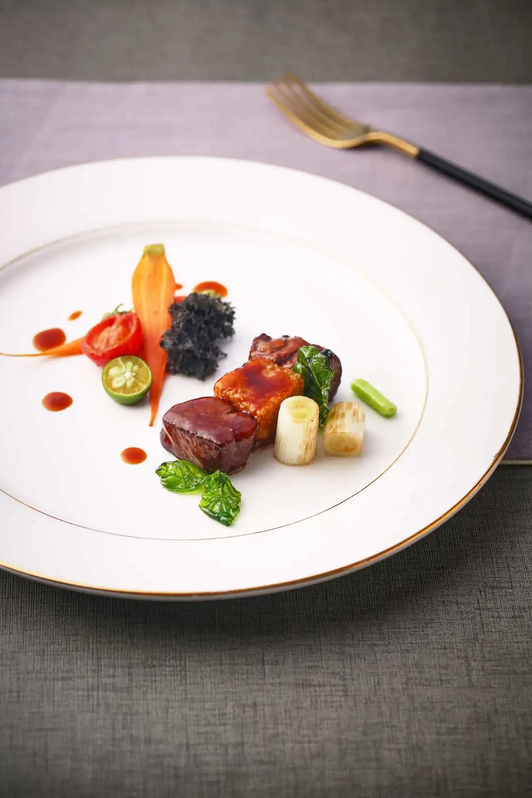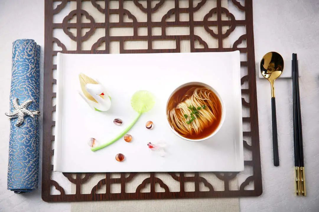 “大师宴”使用国宴的规格和服务要求,精美餐具、菜肴摆盘、服务服装、台布、口布以及整体布置,展现的是一番别有风情的高端宴请,由宾馆主厨精心烹饪,呈现出每道菜肴的精髓风味和巧妙装盘设计。