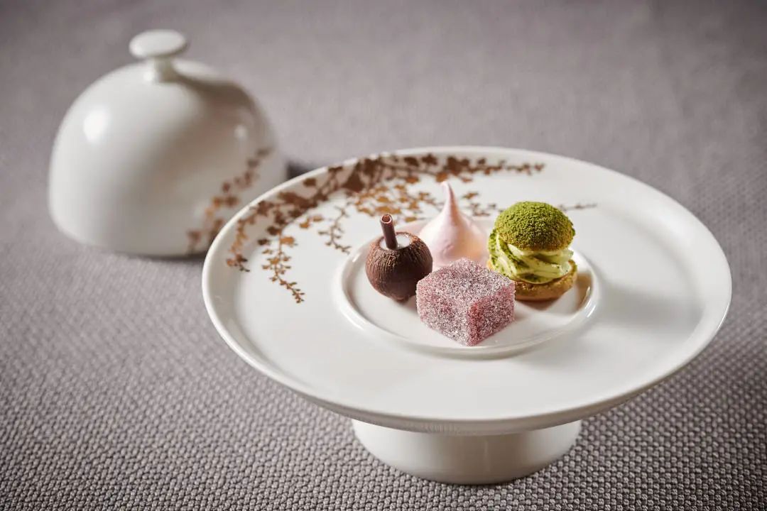 “秋意”下午茶包含三款甜品(伯爵红茶巴斯克芝士、奶酥蛋糕、百香果泡沫),三款咸品(香草三文鱼酸奶油卷、橄榄油浸金枪鱼手指三明治、帕尔马火腿卷蜜瓜),咖啡和红茶各自由选择一款。