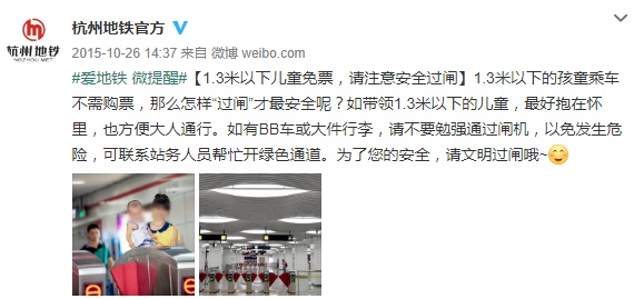 @杭州地铁官方 微博也曾提醒过:1.3米以下的孩童乘车不需购票,那么怎样“过闸”才最安全呢?如带领1.3米以下的儿童,最好抱在怀里,也方便大人通行。
