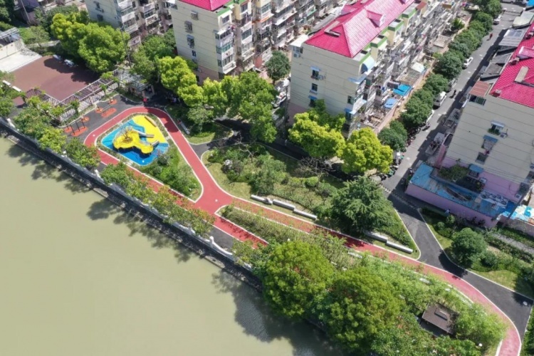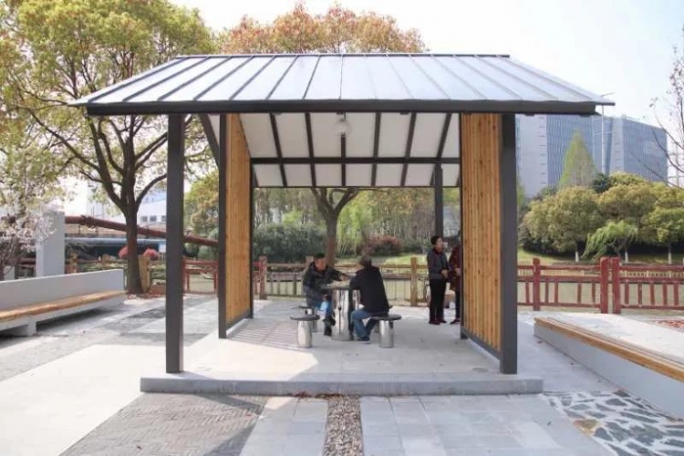 北蔡镇紫叶小区口袋公园在改造前是一个小广场,设施老旧,且缺少照明,存在安全隐患。通过改造,将整个区域划分为7个功能空间,最大限度满足居民的室外活动需求,并保留了原先的舞台、廊架,新增了健身步道以及竹子背景墙、花墙、花镜等,为居民提供了一个交流、娱乐、休闲的场所。