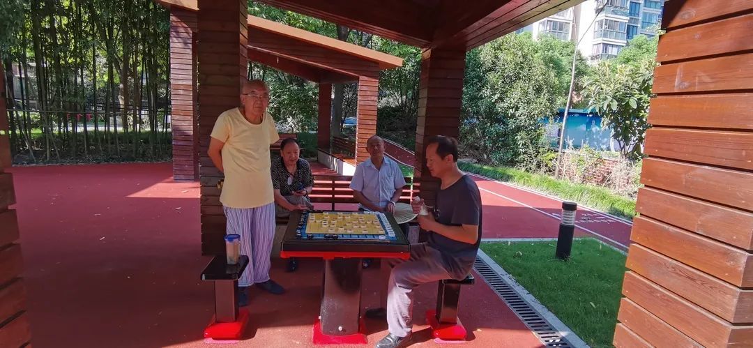 靠近车库入口,有两个小的休闲亭,可供居民小范围的聊天聚会,其中一个亭子还有一个象棋桌,可供爱下棋的居民日常休闲、切磋棋艺。