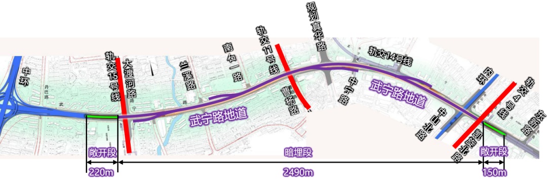 武宁路快速化改建工程西起中环路东侧,向东穿越内环高架路后至东新路,全长约3.5公里,其中明挖地道主线长2.9公里,线路走向基本沿现状武宁路布置,需过大渡河路、兰溪路、曹杨路、中山北路等交叉口,在建轨交14、15号线交叉穿越本工程。此次完工部分为东侧出口敞开段,总长141米,位于在建轨交14号线东新路车站结构顶板上方。详见↓