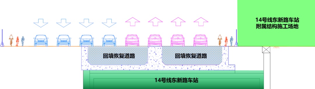 首先施工东新路车站顶板结构,然后将场地移交武宁路项目进行地道敞开段地面以下结构施工并回填道路土基,最后将场地归还东新路车站施工地面道路并恢复交通。