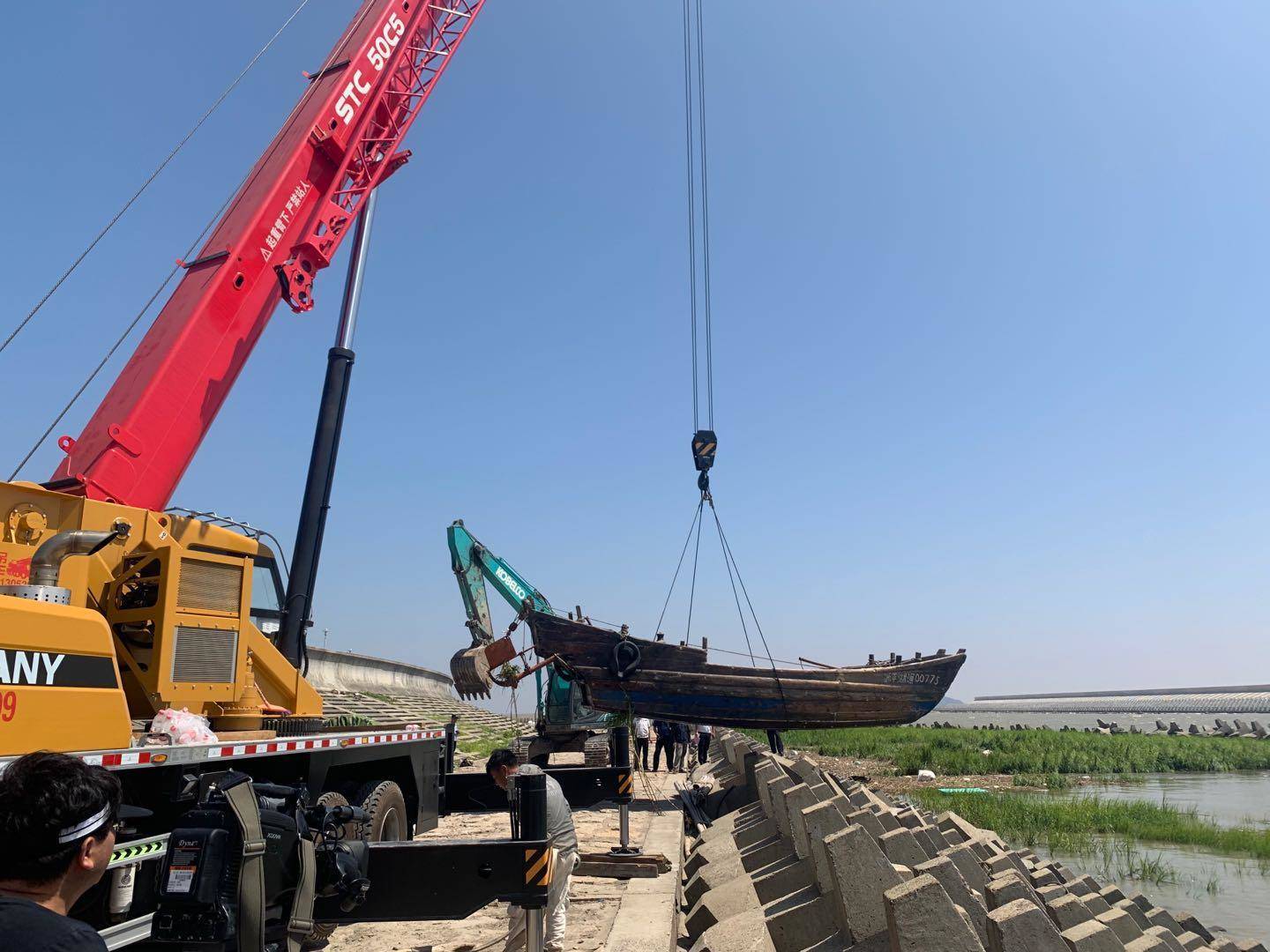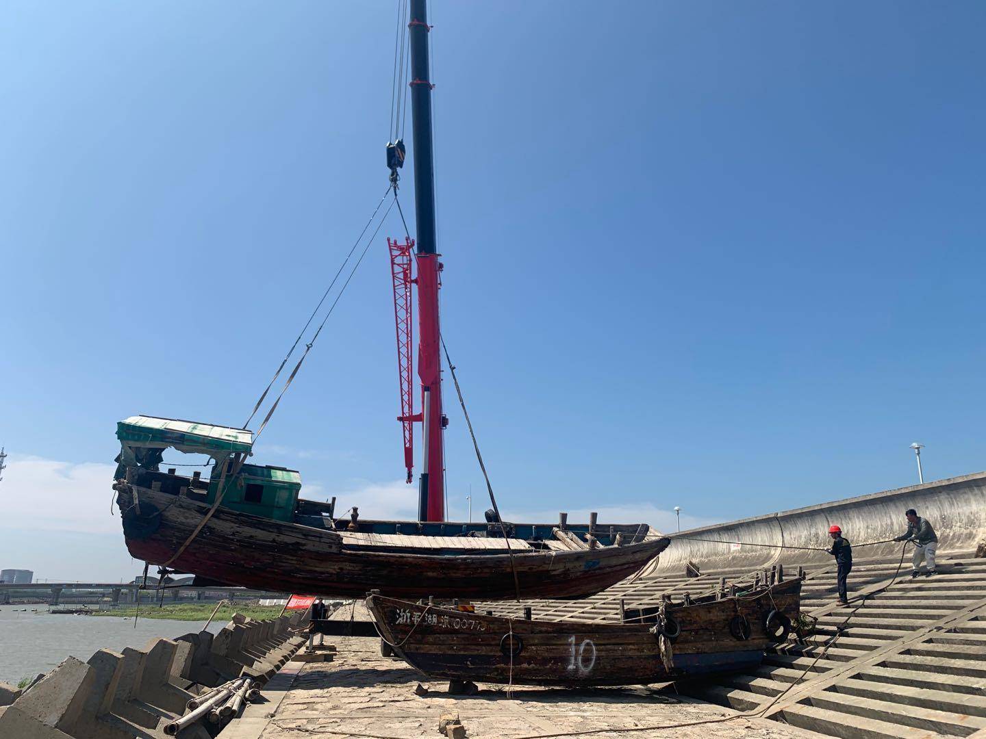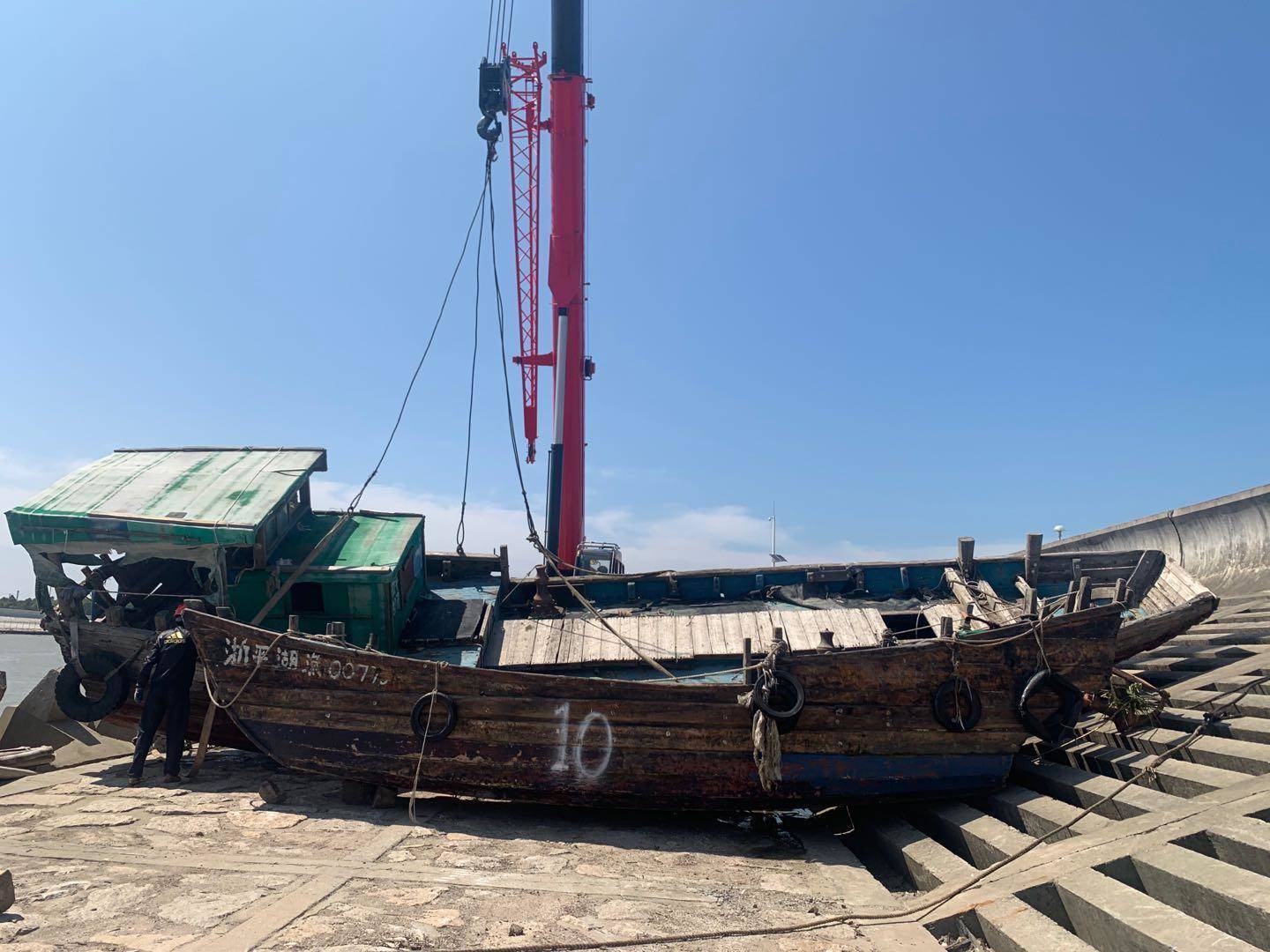 随着起重机的轰鸣声,本次被扣押的三艘“三无”船只被吊至岸上 ,随后在金山区农业农村委执法大队的监督下对这些“三无”船只进行拆解。据了解,本次主要整治范围纬九路海塘外船舶非法停靠点,执法人员在“三无”船舶和套牌渔船船体上做了标记,并对船东们进行现场宣传。