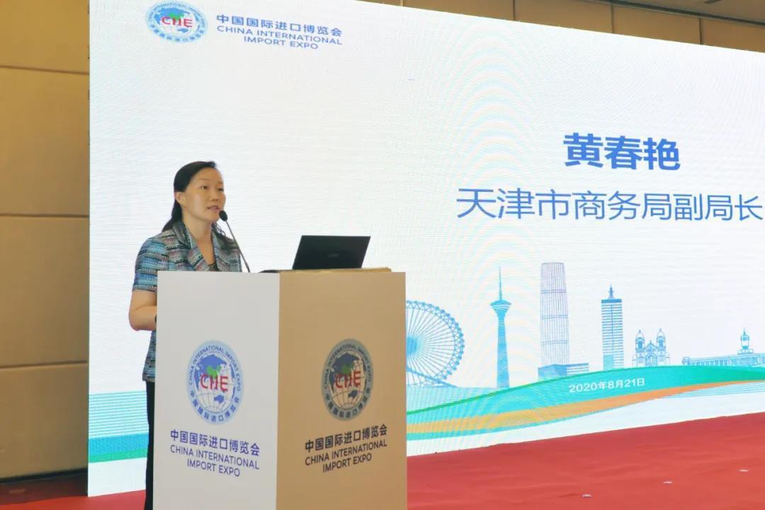 天津市商务局副局长黄春艳致欢迎辞,她表示天津市委、市政府高度重视第三届进博会筹办工作,全力组织高质量交易团参会,并将继续举办配套活动,用足用好进博会这一重大战略平台。