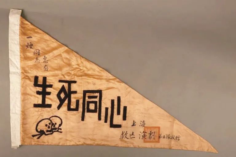 这是上海救亡演剧队第五支队赠予著名剧作家颜一烟(1912—1997)的一面“生死同心”三角旗。
