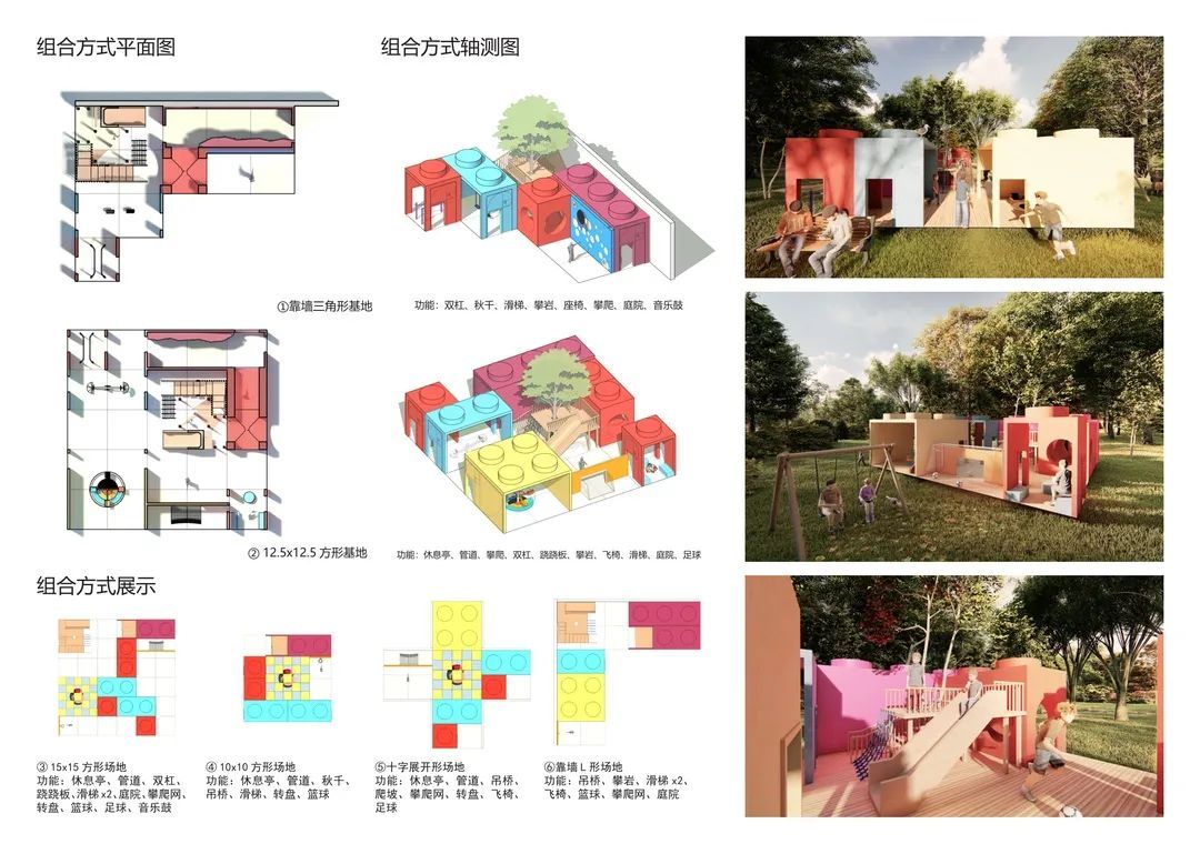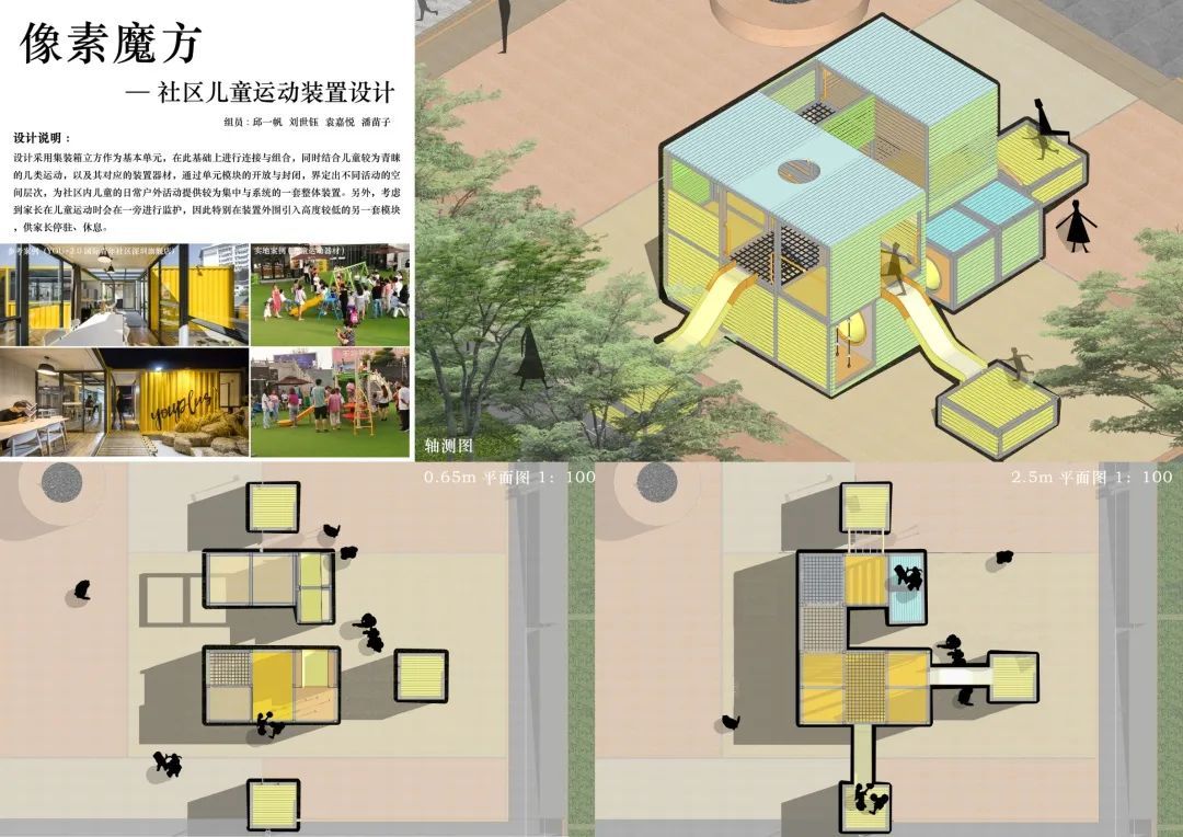 该设计采用近年常使用的集装箱作为基本单元,在此基础上进行链接组合,同时结合儿童青睐的攀爬、滑梯、钻爬等运动,设置对应的器材,通过单元的开放与封闭,界定出不同活动的空间层次;多个集装箱多重组合,为社区内儿童的日常户外活动提供系统的整套装置,并植入家长驻足、休憩、看护的模块系统。