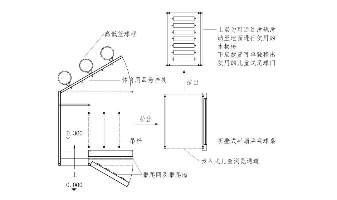 同时这一设计还通过各种腾挪移转变化出供青少年儿童体适能锻炼的设施,在节省场地空间的同时富有趣味性。比如隐藏在正方体模块中的吊杆、攀爬网、木板桥、儿童式足球门、半扇式乒乓球桌等等,为青少年儿童提供了多种运动形式。