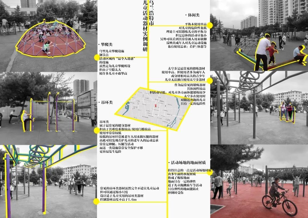 本案例位于内蒙古乌兰浩特市中心广场的儿童活动区,此区域是一处年份较久、使用频率极高的儿童活动区域,也是城市中仅有的适宜儿童的活动公共空间。本案例着重研究器材类型、场地铺装与儿童活动方式、活动量、安全性、使用频率之间的关系,归类了适于少年儿童运动的器材,指出了惯性思维下儿童活动区域器材选择的不足。