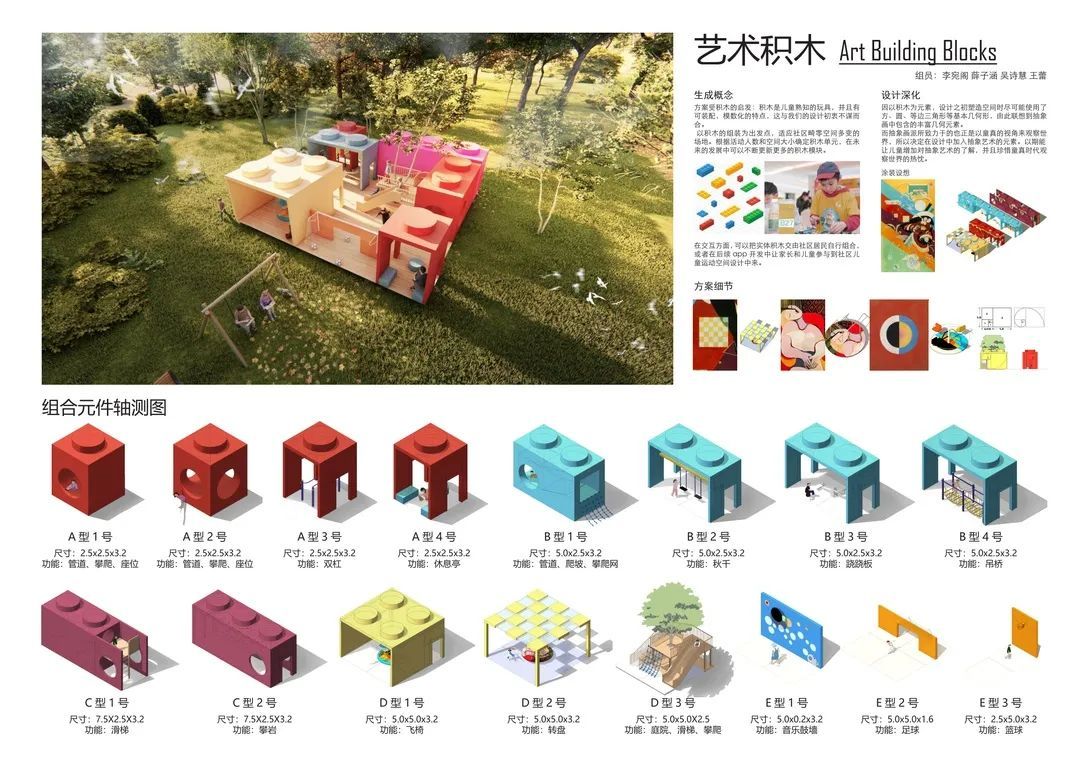 本方案受积木的启发,以积木的组装为特点,适应社区畸零空间多变的场地,根据活动人数和空间大小确定不同类型的积木单元,在未来发展中也可以不断更新。实体积木可以交由居民自行组合,或在后续app开放中让家长和儿童参与到社区运动空间设计中。
