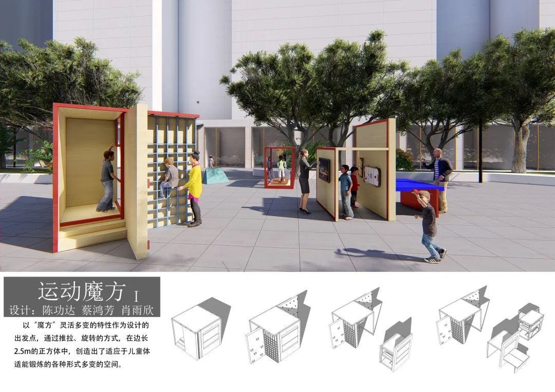 该设计以“魔方”灵活多变的特性作为出发点,通过推拉、旋转的方式,在边长为2.5m的正方体模块中,创造出适应于儿童体适能锻炼的形式多变的空间。