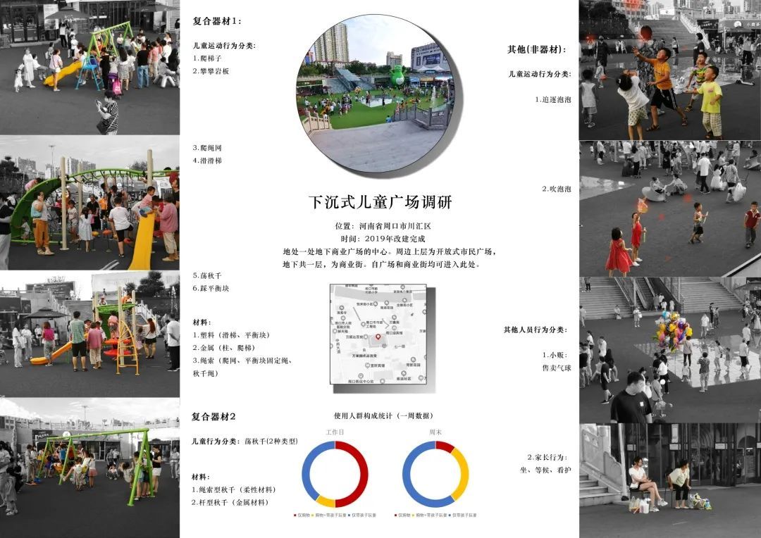 本实地案例位于河南省周口市,改建于2019年。本区域位于一处底下商业广场的中心,周边为开放式市民广场;自广场和商业街均可进入此处。本案例重点调研了儿童活动器材的形式、数量、材质与儿童行为、活动安全性之间的关系,并归类了以儿童活动为中心、向外发散的成年人活动的空间需求。