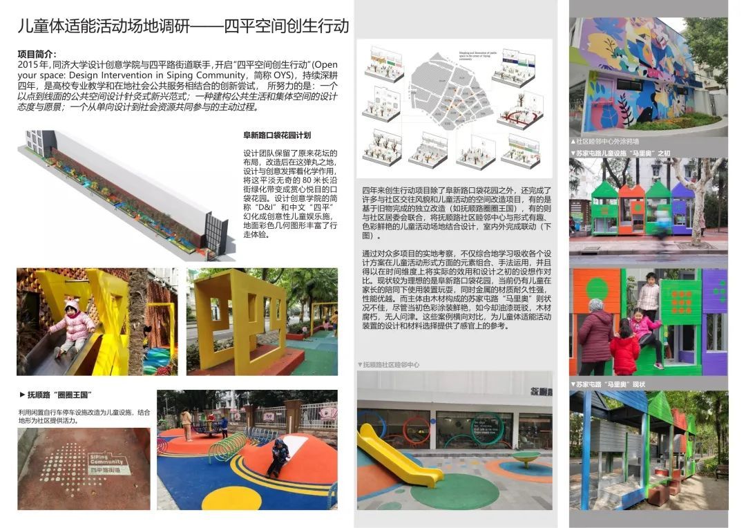 该案例地点位于上海市阜新路上。2015年同济大学设计创意学院与四平路街道联手,开启“四平空间创生行动”,以探索高校专业与在地社会公共服务结合的新模式。这一保留原有花坛布局,在其中植入从点到线面的儿童活动空间,用字母的形式化成创意性儿童娱乐设施,并用彩色几何图案丰富行走体验,满足儿童探索欲望。